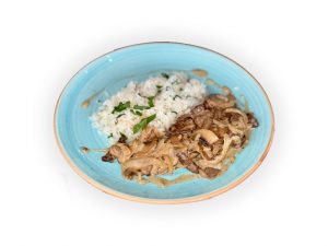 БЕФСТРОГАНОВ З ЯЛОВИЧИНИ З РИСОМ