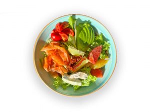 Кнелі з Філадельфії · авокадо · свіжі та в’ялені томати · ікра Тобіко · каперси · філе цитрусів · апельсинова заправка · соус Юдзу
