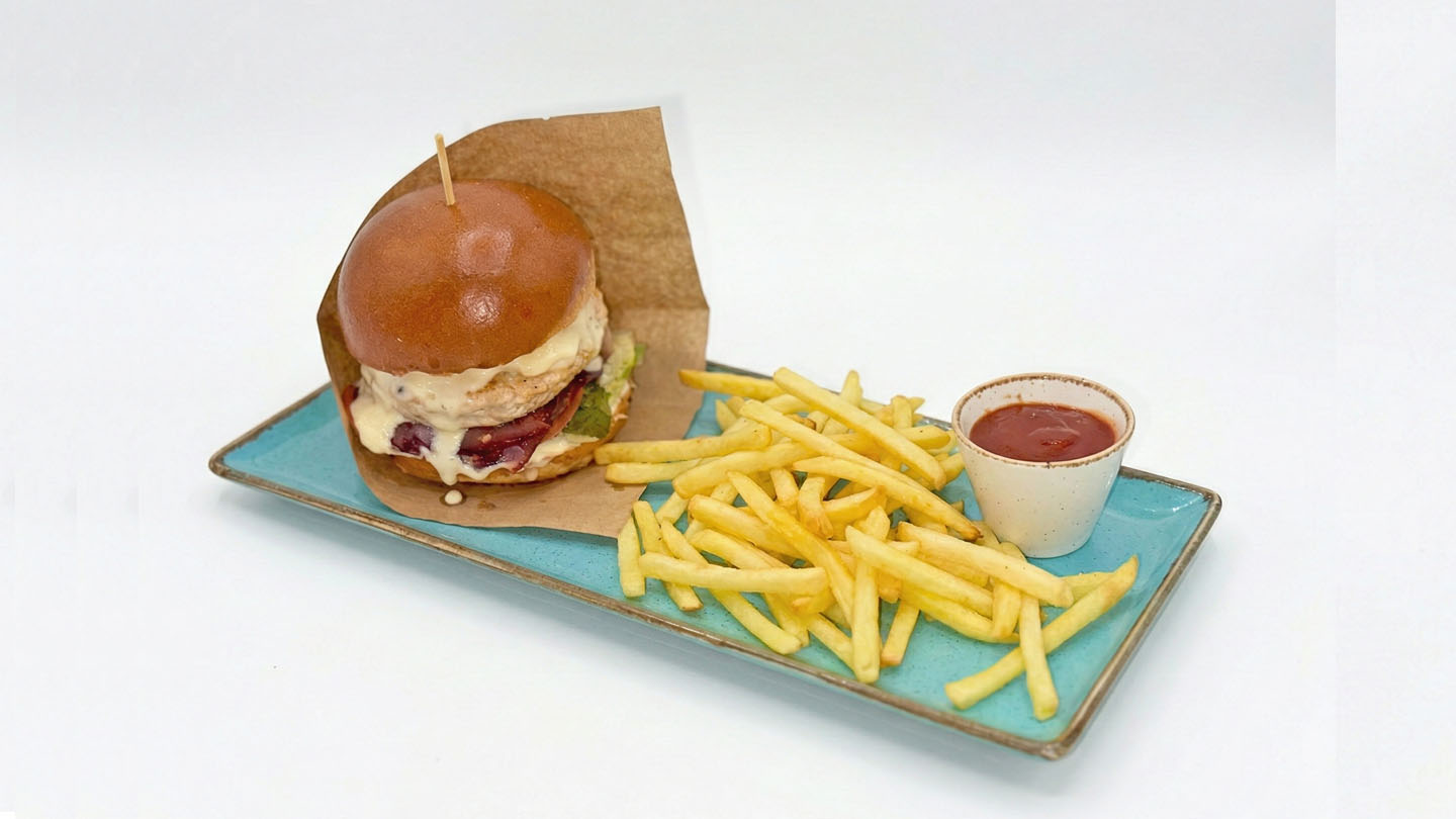 Булочка бріош · котлета з індички · сирний соус · томат · зелень · груша маринована у вині · соус гляс · бальзамічний оцет · моцарела · картопля фрі · соус ДорБлю