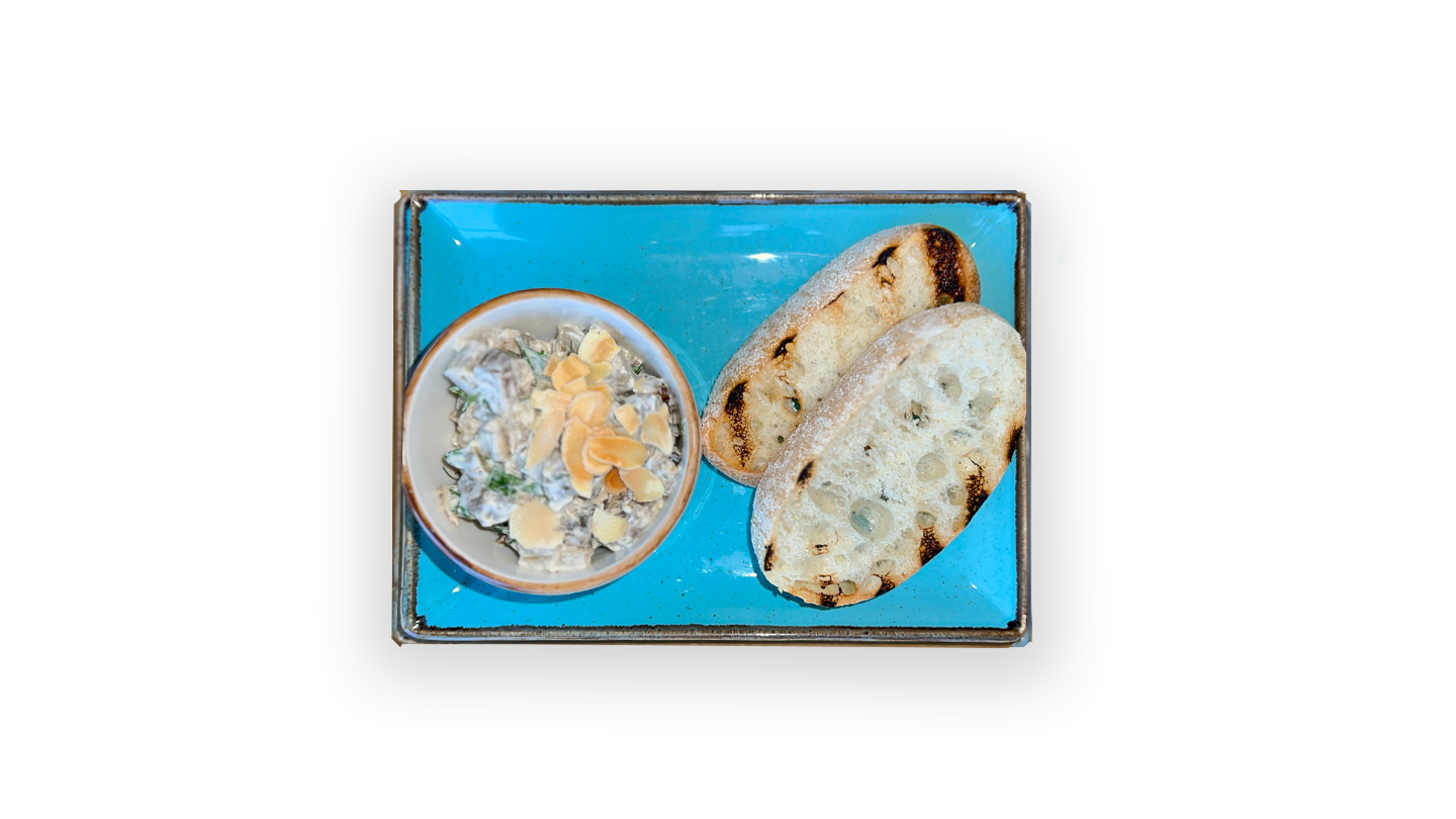 Чіабата · печений баклажан · йогуртовий соус з лаймом · мигдалеві пластівці