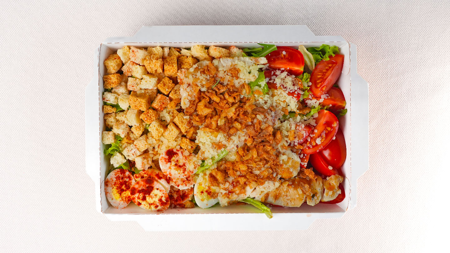 Листя салату · куряче філе · перепелині яйця · томати · Пармезан · крутони з сиром Пармезан