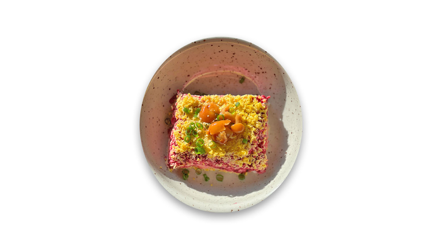 Буряк · морква · картопля · яйце · маринована цибуля · консервовані опеньки · соус айолі