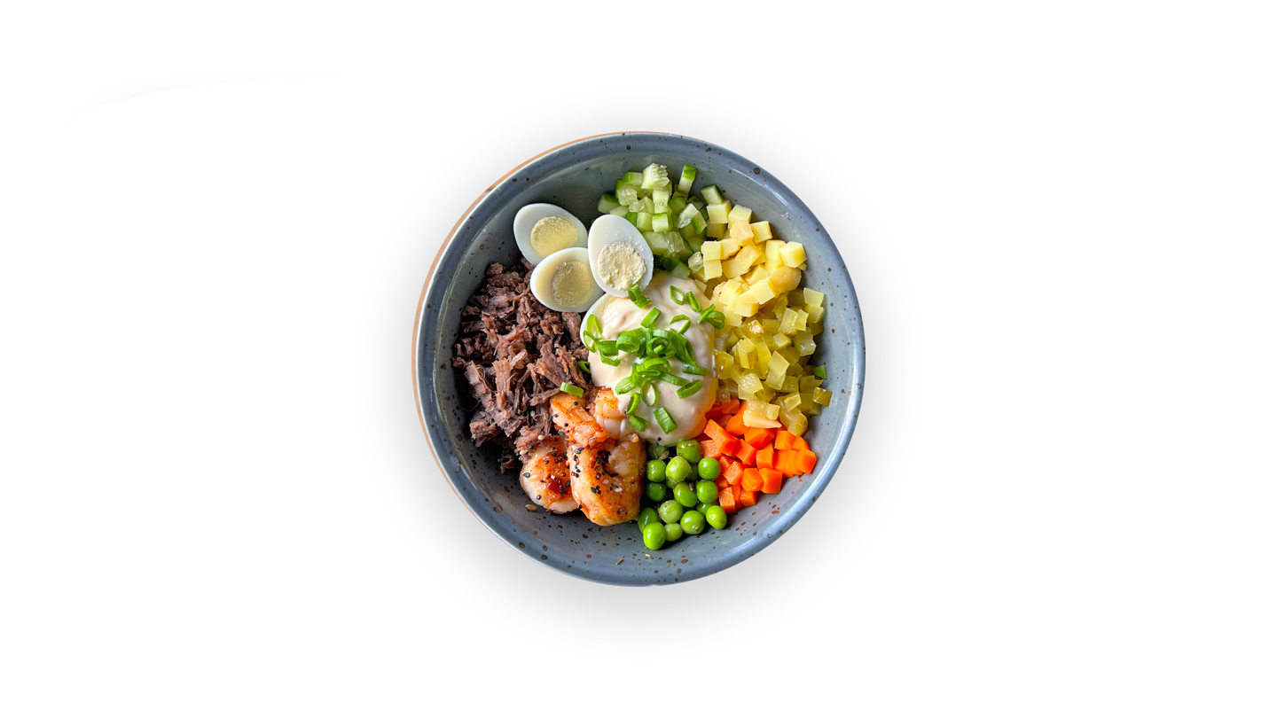 Перепелине яйце · картопля · морква · свіжий огірок · солоний огірок · горошок · пікантний соус айолі · зелена цибуля · мікс зернових