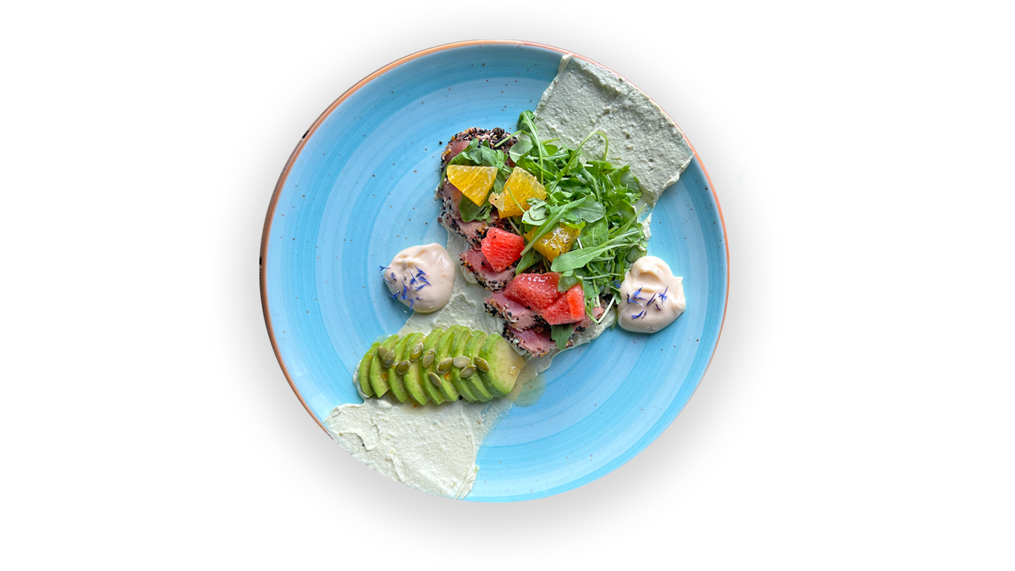 Авокадо · філе цитрусів · руккола · соус Юдзу · пікантний айолі · гірчиця · насіння