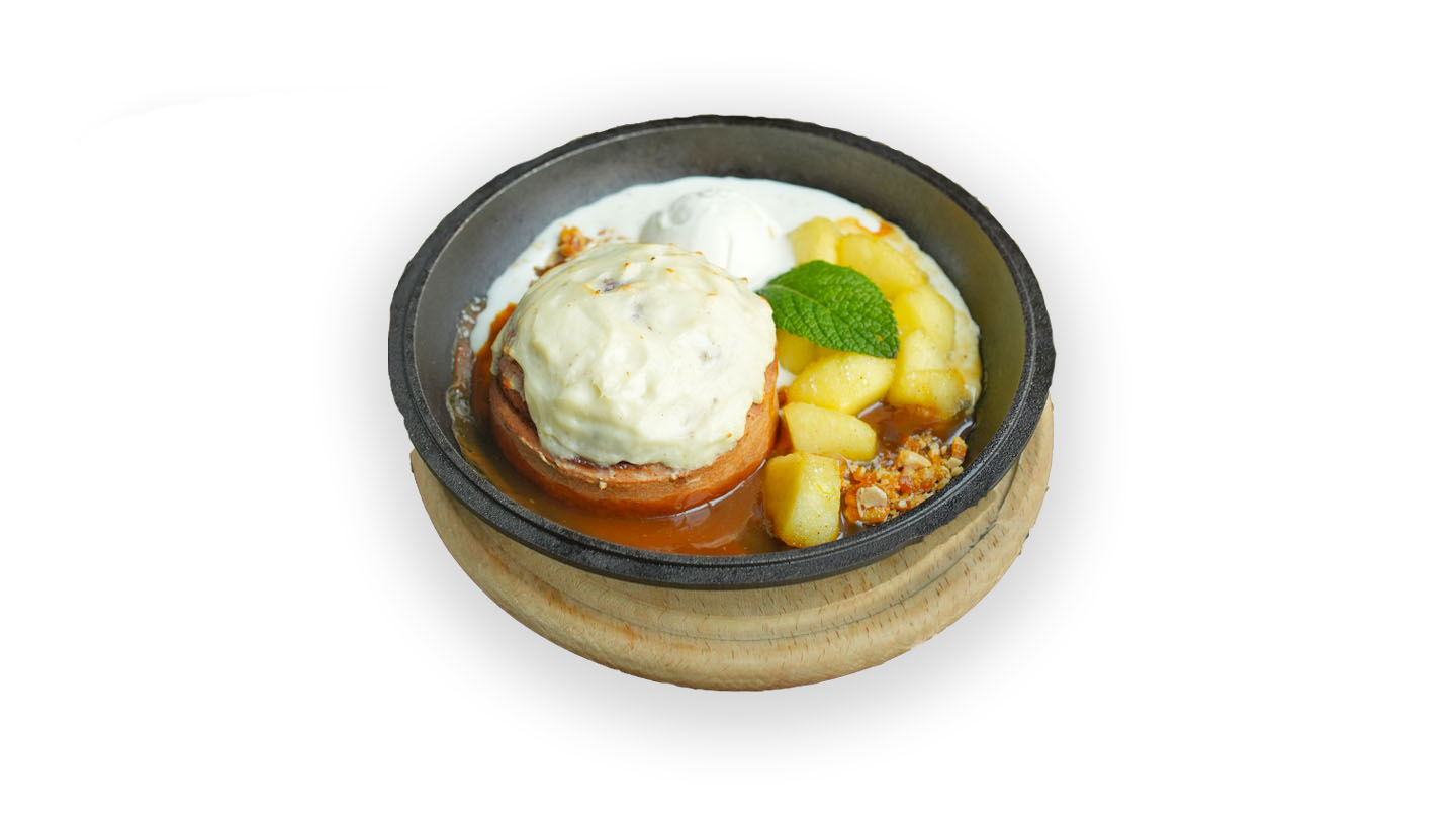Ванільне морозиво · карамелізовані зі спеціями яблука · карамелізований арахіс · солона карамель